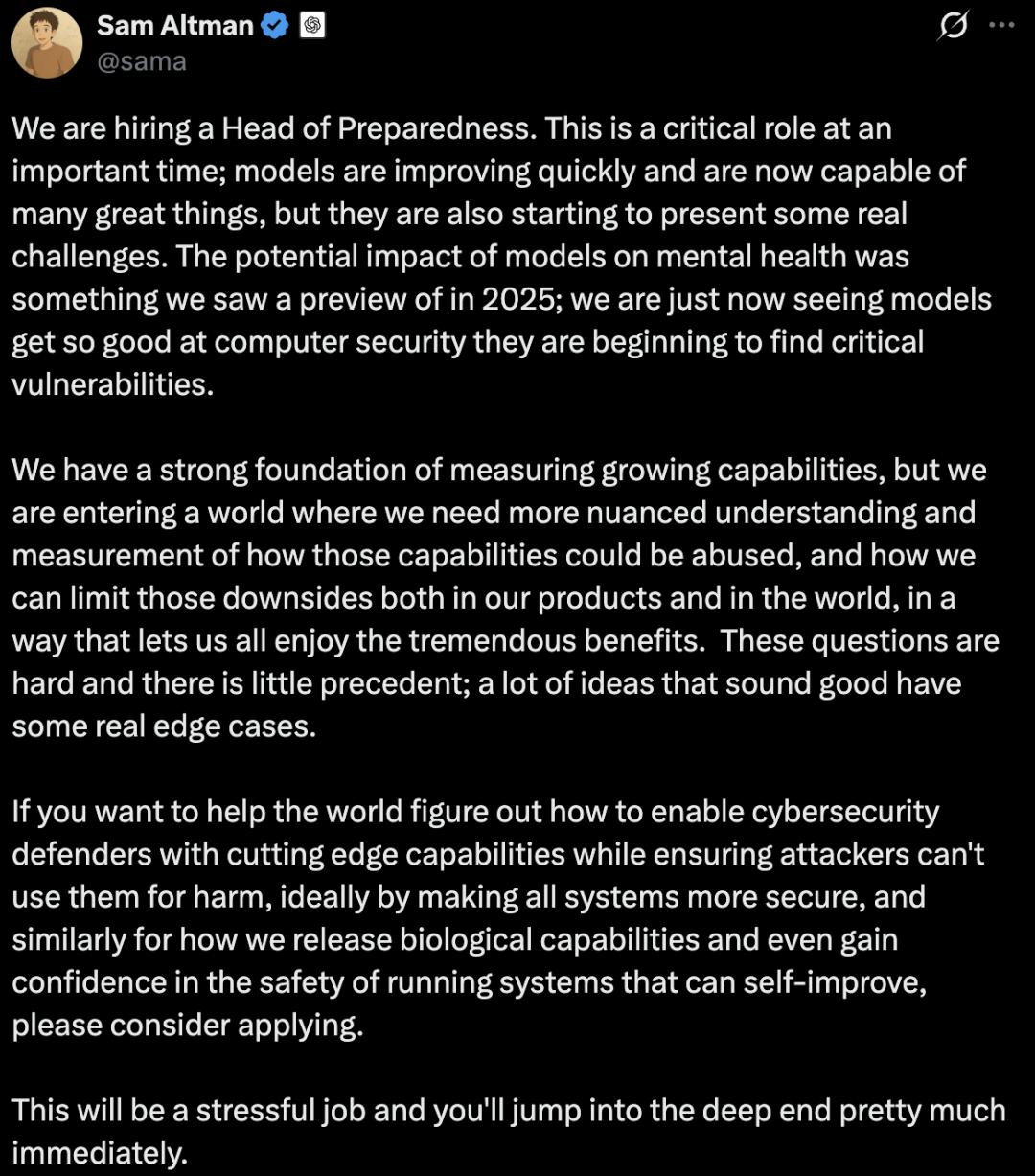 近日,奥特曼发帖要为OpenAI招募一位「准备工作负责人(Head of Preparedness)」。