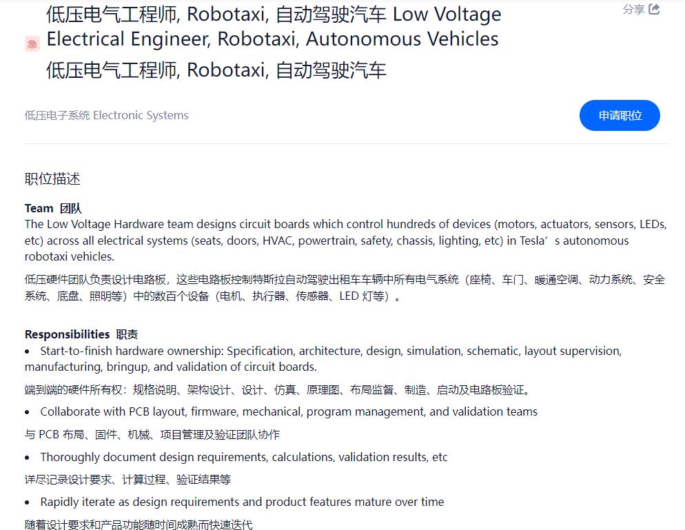 岗位所属的低压硬件团队,主要工作是负责设计特斯拉Robotaxi的核心电路板。