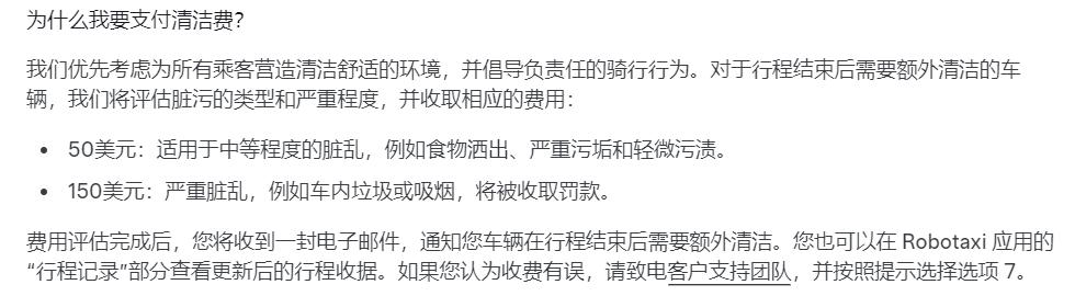 其中有一项最近新增的内容相当特别:特斯拉为Robotaxi加入了一个“清洁守则”,并引入了两级处罚制度: