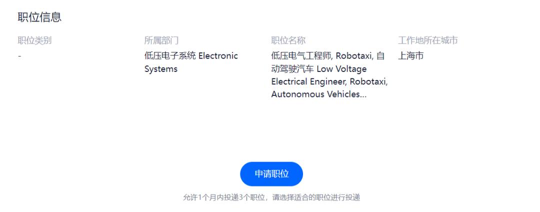 特斯拉中国招聘主页,正在急聘一名低压电气工程师,工作地点就位于上海。