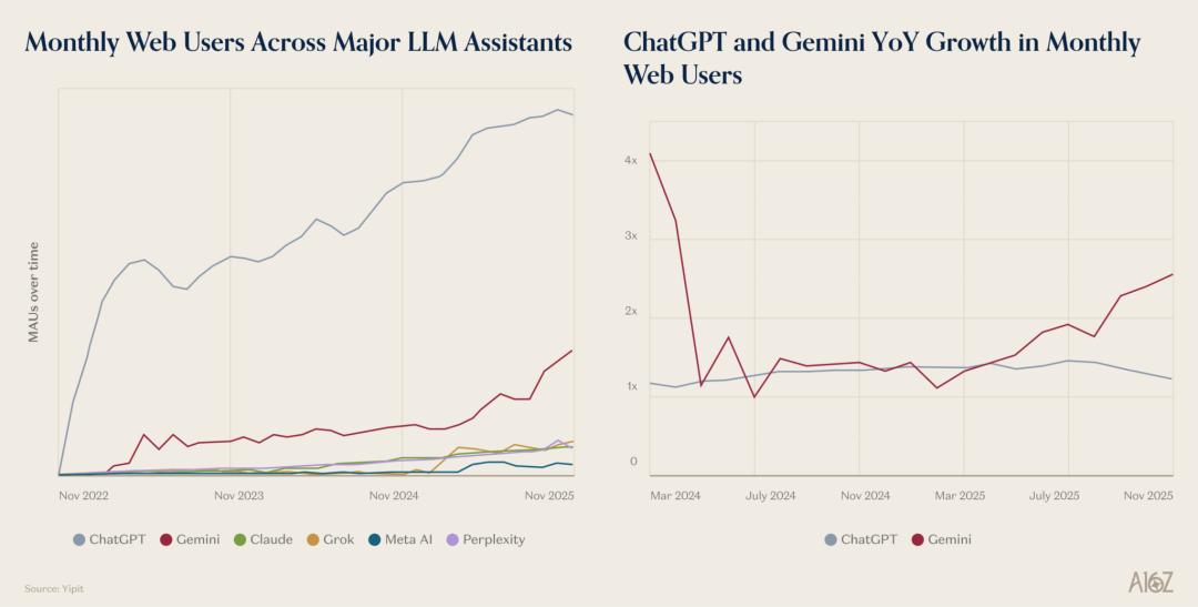 主要大语言模型助手的月度网页端用户数;ChatGPT与Gemini月度网页端用户数同比增长趋势数据来源:Yipit