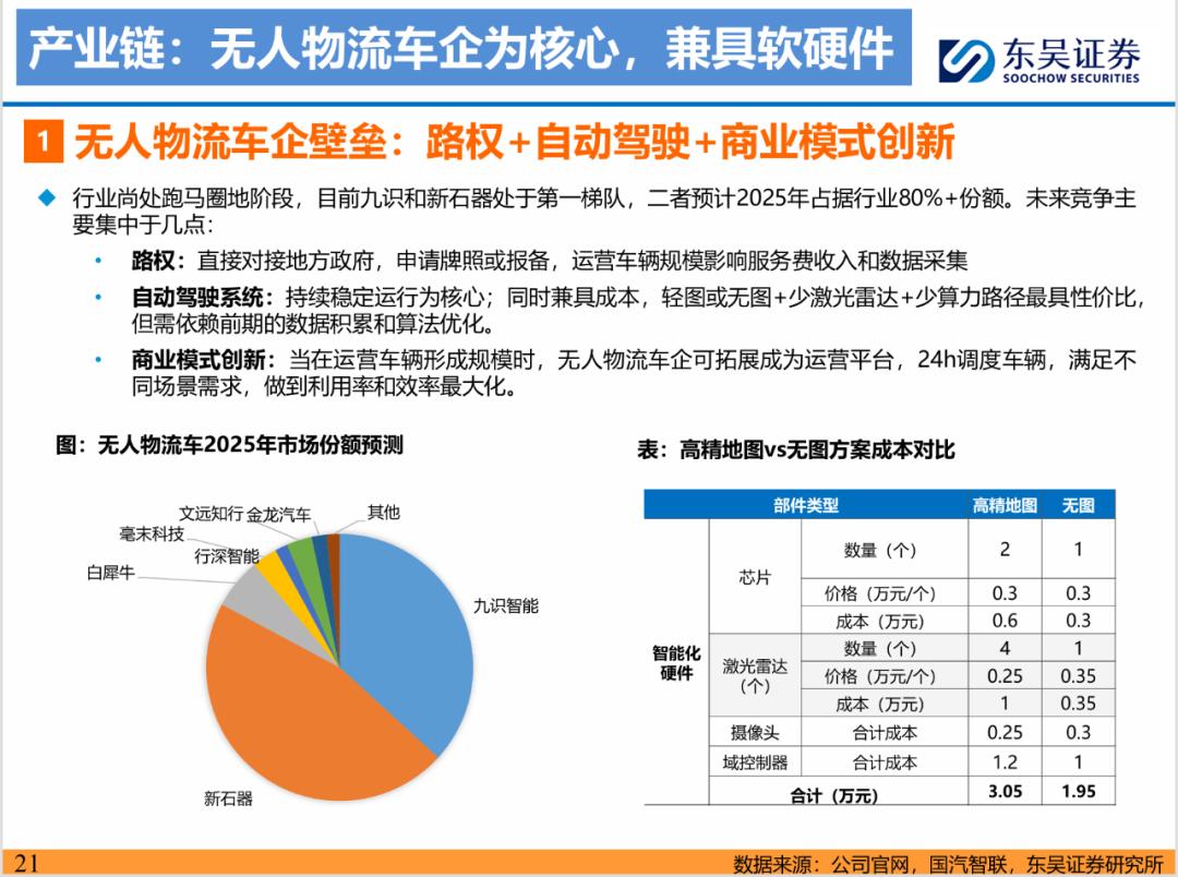 技术成熟度差异:新石器、九识智能的L4级自动驾驶方案在复杂城市场景中事故率低至1.5次/万公里,通过“轻图模式”适配全国300多个城市道路;而中小玩家技术仅能覆盖单一省份或特定场景,泛化能力不足,难以在更大范围内的市场有效突破。