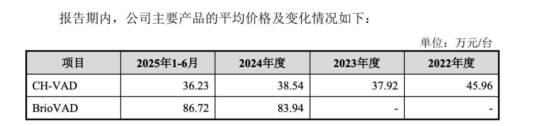 报告期内,公司产品价格整体较为稳定,2022年、2023年、2024年及2025年上半年,CH-VAD的平均价格为45.96万、37.92万、38.54万以及36.23万,CH-VAD 售价有所下调主要系公司为在我国人工心脏行业高速发展期快速拓展客户,不断提高市场占有率,建立稳固的客户基础而主动调整价格。