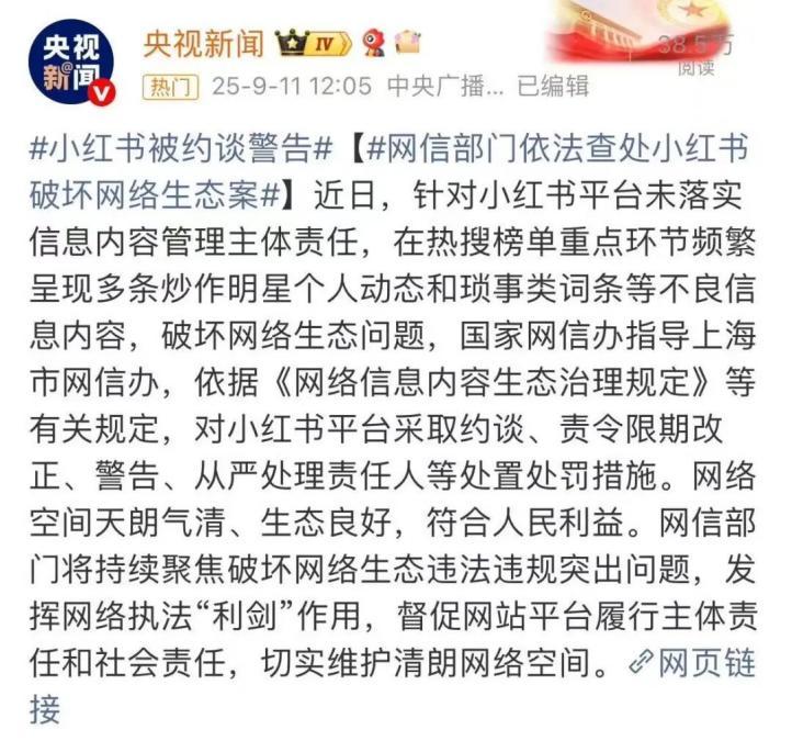 紧接着的9月,国家网信办发布通报,针对小红书热搜榜单“频繁呈现多条炒作明星个人动态和琐事类词条等不良信息内容”的违规行为,依法开展查处工作,一时间引发不少关注。