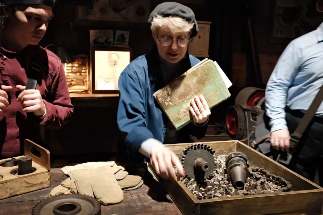 通往一个“边境村庄”展厅的路上,“砰”的一下巨大响声传来,整个导赏团被拦住了。一个由工作人员扮演的“俄奸”,用枪托砸着地板,威吓参观者出示“良民证”。这“良民证”是前一个场景里,导赏员托其中一位参观者拿着的道具。后面还有穿蓝布工服的兵工厂女工、整理画卷的学者、穿白大褂的医生等NPC,从自己扮演的角色出发讲述历史故事。