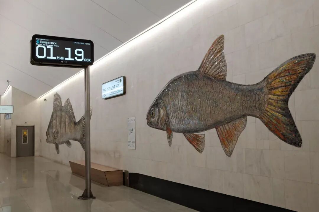 △莫斯科大环线上的Nagatinsky Zaton地铁站,马赛克大鱼让我们惊艳得中途下车。(图/晓洋 摄)