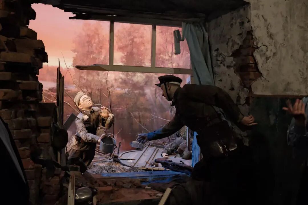 展览的布景是等比例还原的。真人比例的雕塑、两层高的废墟、扭曲的巨大工字钢、冲破砖墙的坦克……各种真实到令人震撼的细节,复刻出俄罗斯卫国战争中后方劳动者的贡献与力量。人物塑像里很多是历史上有名有姓的普通人。