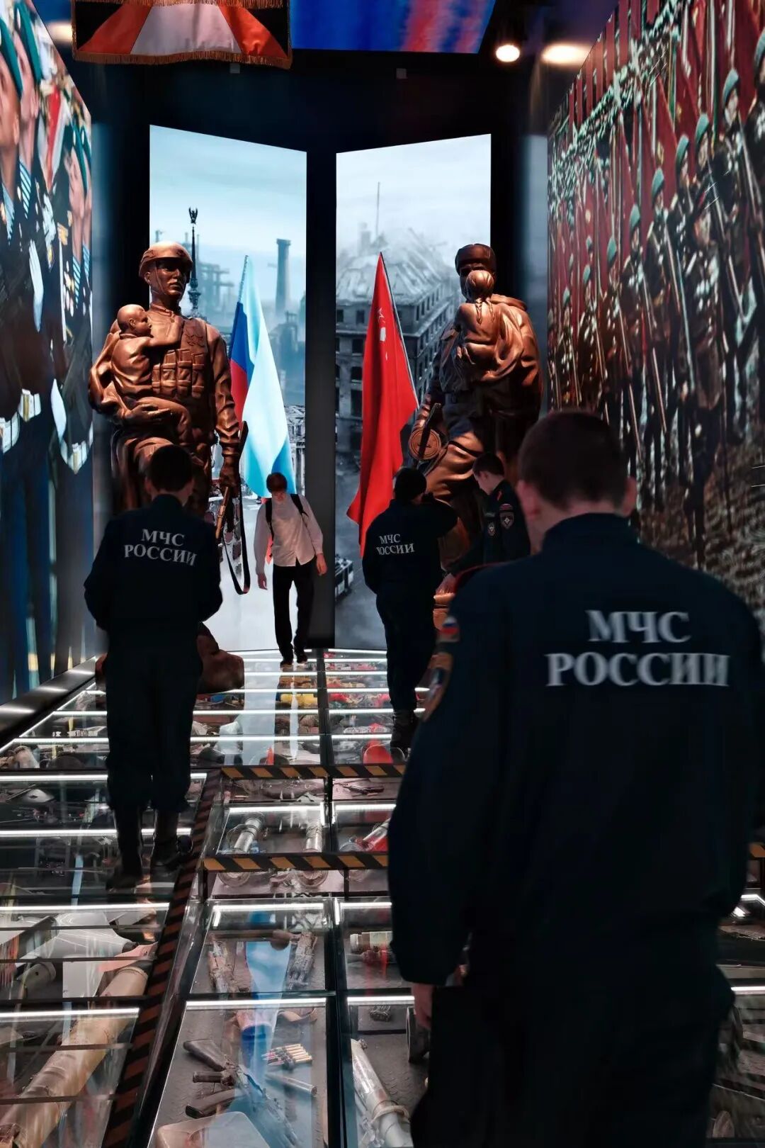 展览中延续胜利博物馆的“真实感”。里面展示了俄军在海陆排雷、无人机打击等活动中使用到的装备,墙面循环播放相关的战争片段。地面玻璃柜里铺设了从前线收集来的大量物品,包括地雷的碎片、收缴的武器、扭曲的路牌等。踏着这些战利品,一脸稚气的年轻士兵走向高大的军人雕塑。