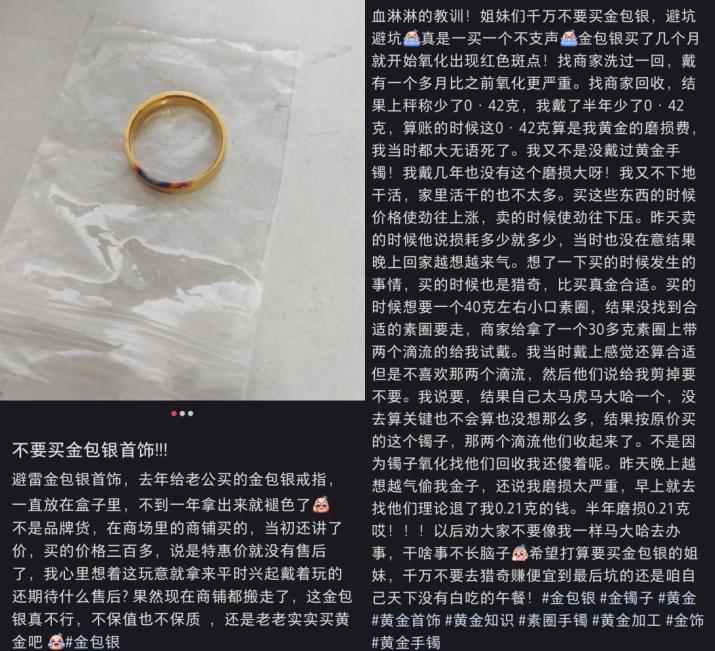 有购买过金包银的网友也在社交媒体分享称,买的时候商家保证可以换款和回收,但等自己真去换款的时候,商家已经倒闭了。到黄金市场的其他商家检测时,发现含金量与购买时宣称的不符。