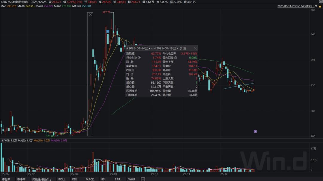 不过,这并不影响市场对影石的热情。“撒钱”视频流出后,影石股价一路飙升。Wind数据显示,8月14日至8月19日,影石股价从187.02元飙至300元,涨幅达62.77%。