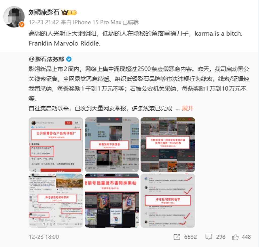 近日,影石创新(下称“影石”)法务部在微博发布消息称,旗下新品影翎无人机遭遇了超过2500条有组织的恶意攻击。并启动全网悬赏征集恶意造谣、组织诋毁影石品牌等黑公关线索,一旦线索被采纳每条最高奖励万元,若被有关机关采纳最高可达10万元;同时晒出多条已完成核查的固证奖励。