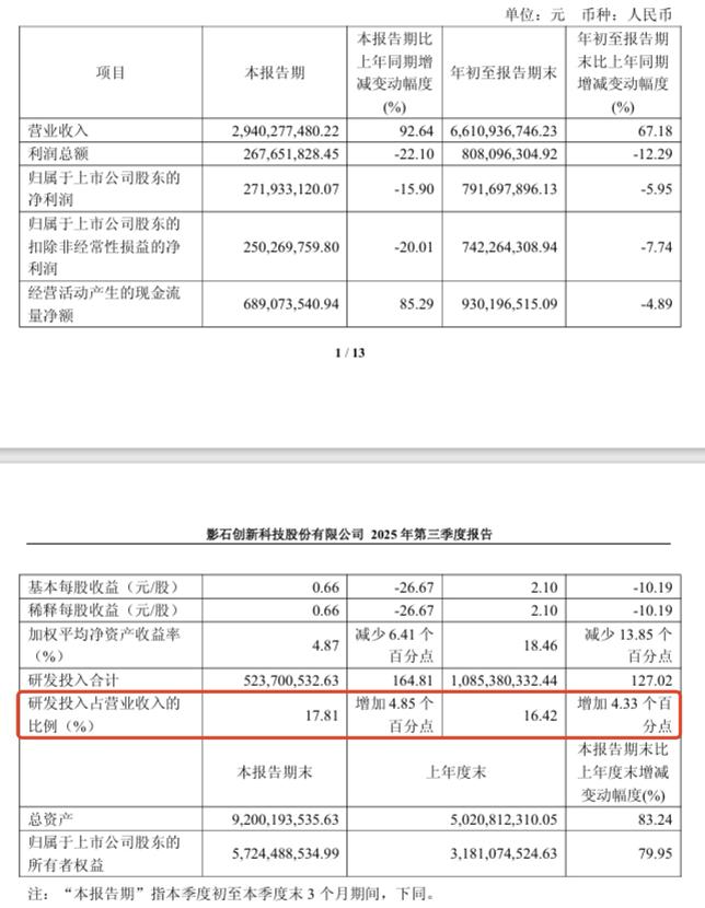 净利润下滑与研发投入大幅增加直接相关。2025年前三季度,影石研发费用同比飙升127.02%至10.85亿元,占营收比重约16.42%。其中第三季度研发投入同比增长164.81%至5.24亿元,占比升至17.81%。