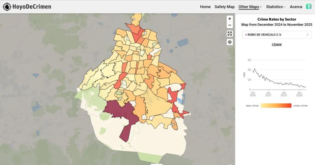 用HoyoDeCrimen(Crime Map)还有ChatGPT,来整体查看墨城的治安情况,在网上把自己要去的地址输入进去,可以通过地图看到各个区真实的报警和治安情况,红色和深色区域不要去,夜晚尽量避免出行。
