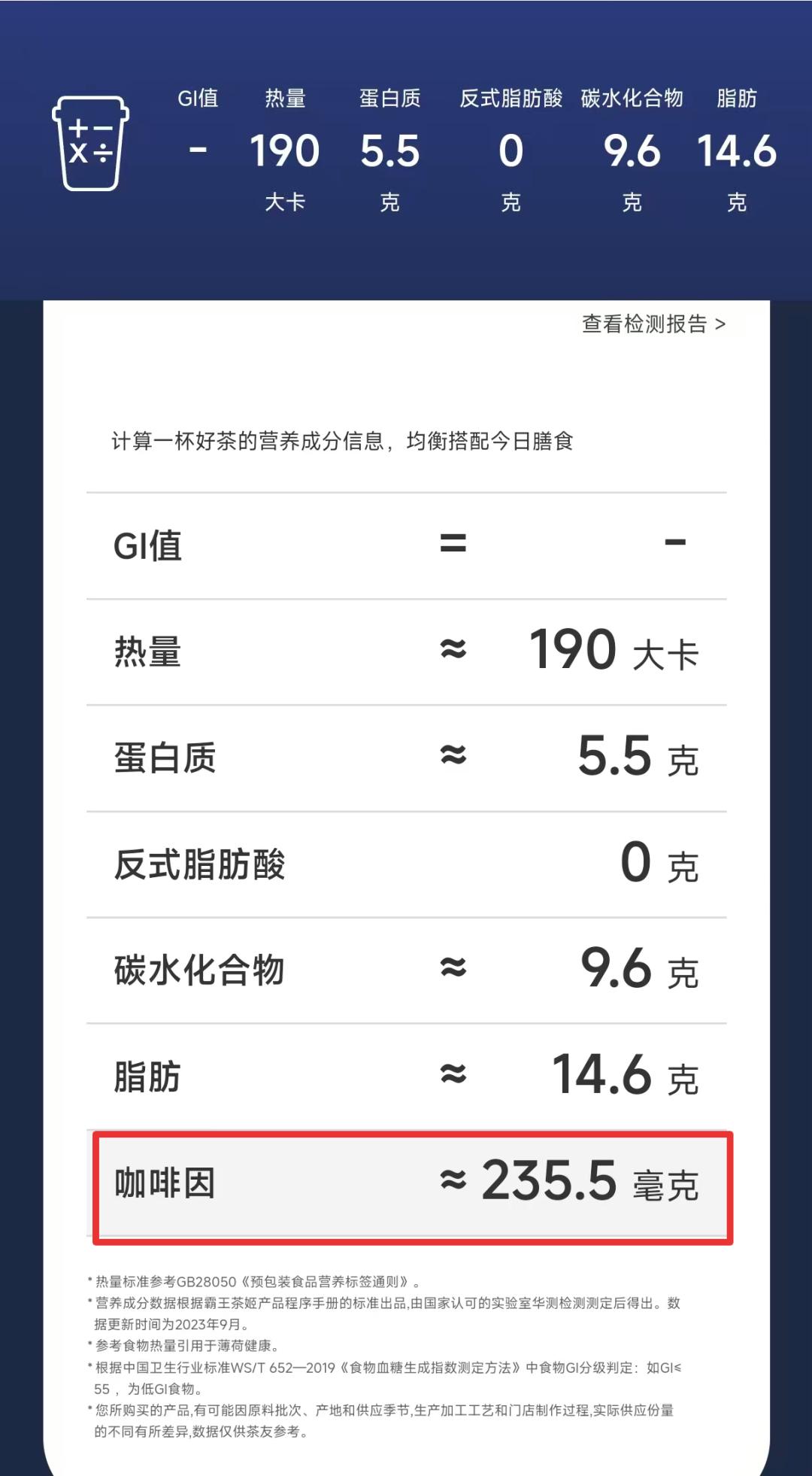 先说被蛐蛐“比较猛”的万里木兰的数据,按照大杯实际容量580毫升,显示含有235毫克咖啡因含量。