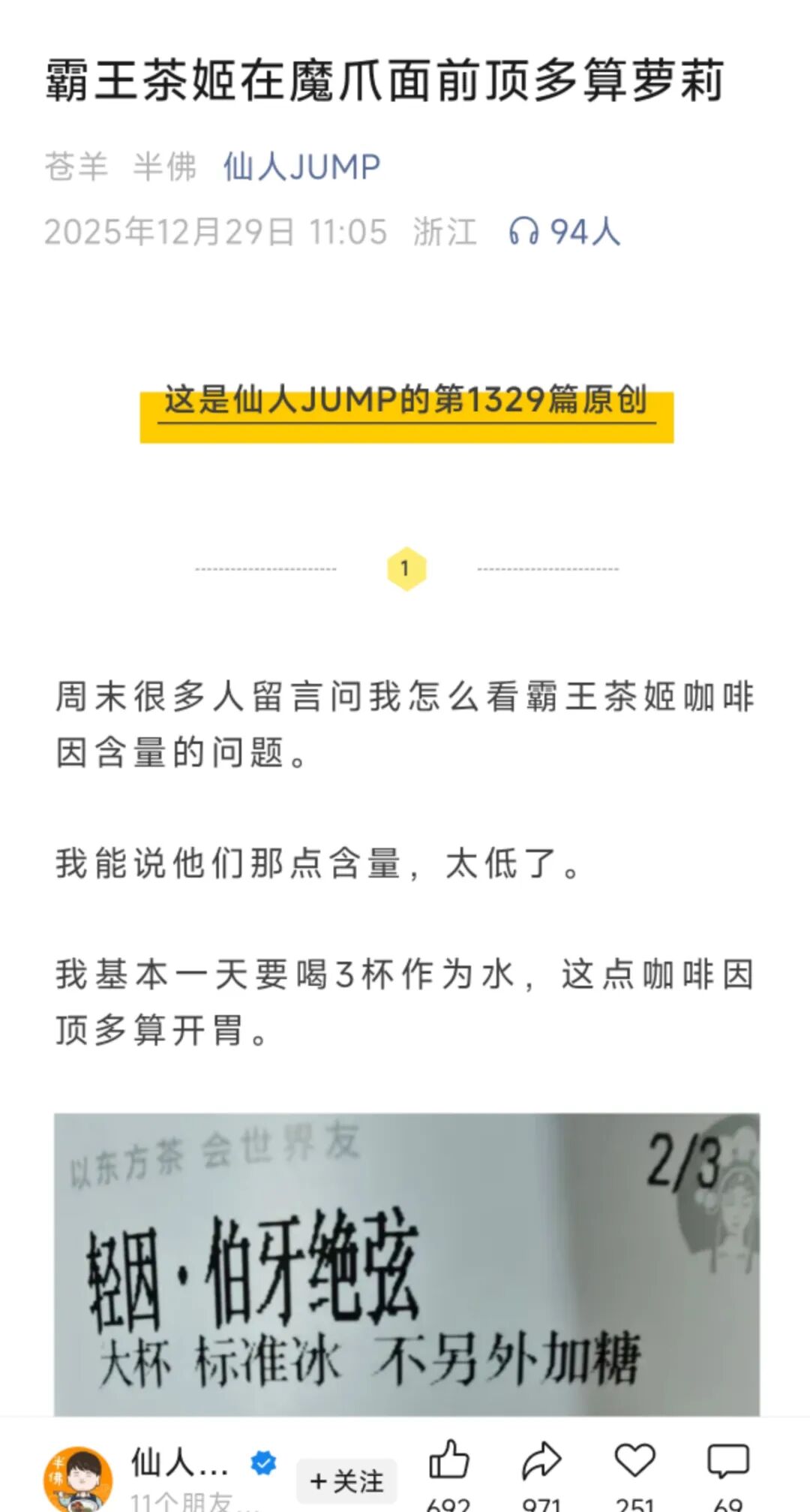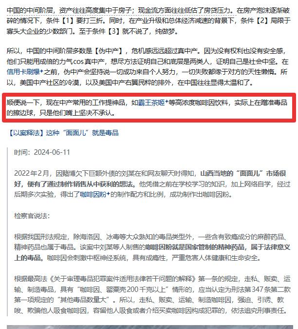而实际上,那么大一坨里,“霸王茶姬等高浓度咖啡因饮料,实际上在蹭准毒品的擦边球”被摘出来,单独传播,就是符合传播规律的常见状态。