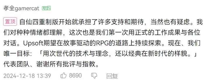 「自仙四重制版开始就承担了许多支持和期待,当然也有疑虑。我们对种种情绪都理解,这次也是我们第一次用正式的工作成果与各位对话。Upsoft期望在故事驱动的RPG的道路上持续探索。现在、我们唯一目标:“用次世代的技术与理念,还以经典在新时代的样貌。”代表团队、谢谢所有批评与指教。」