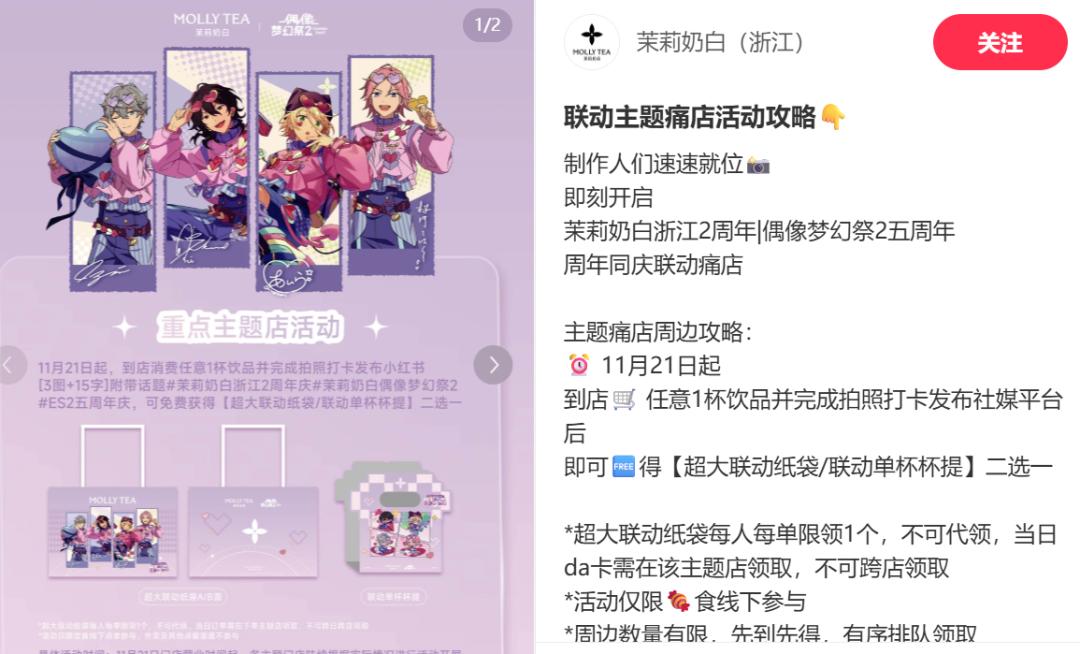 从全国巡演触及的粉丝受众到垂类圈层的游戏玩家,这两次联名都意在扩大辐射范围。中小品牌与高影响力IP的联名能为其拓展用户认知度,让加盟商在线下的同类竞争中更具有竞争力。