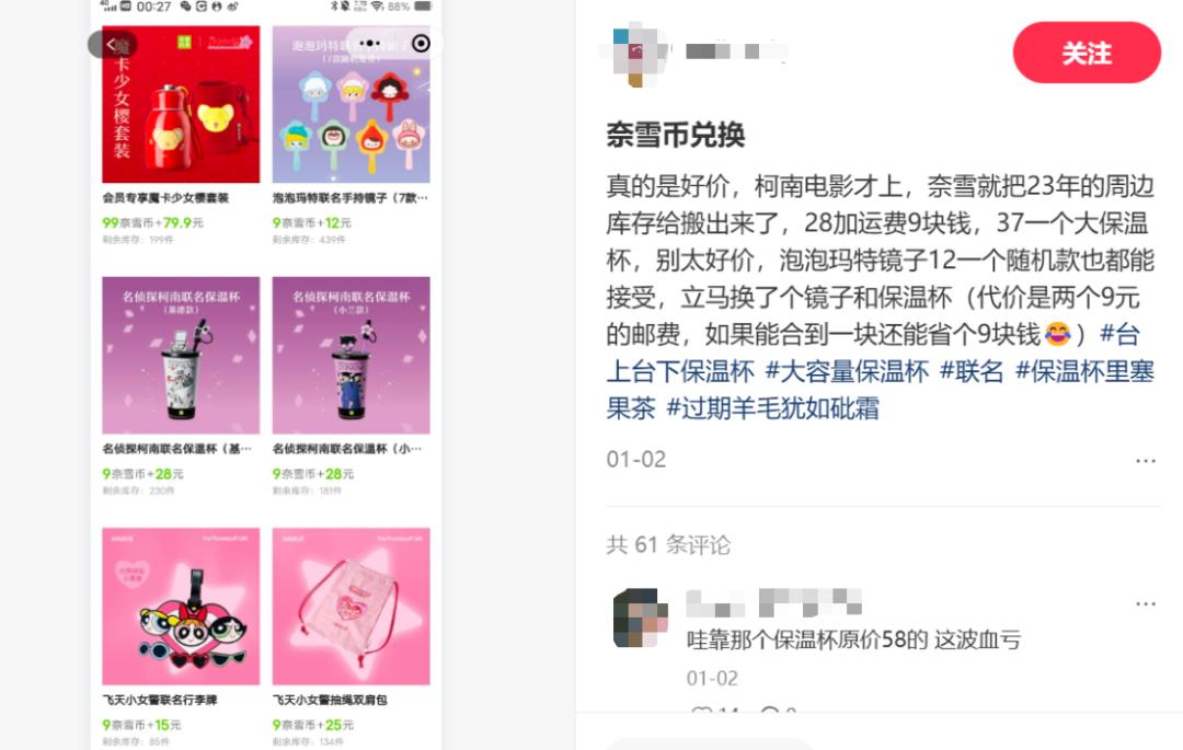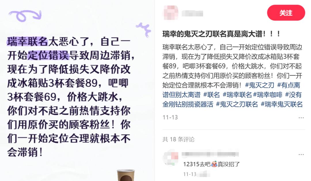 瑞幸也面临着相似的舆情:大量消费者反馈,瑞幸与《鬼灭之刃》联动的冰箱贴与八杯套餐绑定,但仅在三天之后容量被瑞幸改为三杯。“前期断货,后期滞销”的状况频发,周边清仓贬值的周期也越来越短,让当初砸下真金白银的消费者感到被背刺。