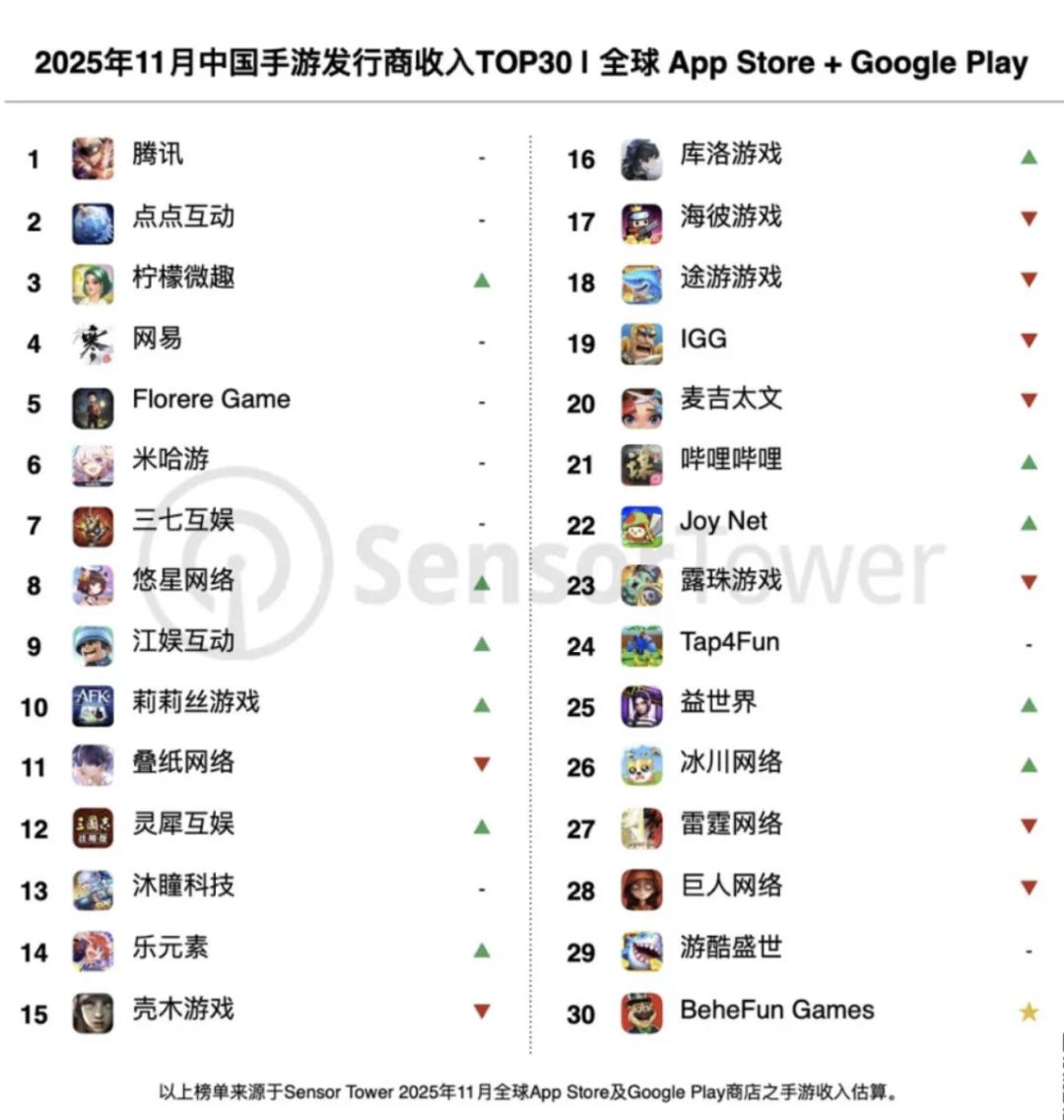 2025年11月中国手游发行商 TOP30 来源:Sensor Tower