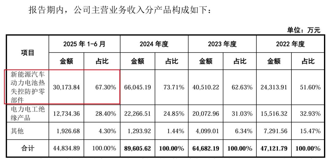 于2025年中期末,新能源汽车动力电池热失控防护零部件(以下简称“动力电池零部件”),为固德电材贡献了主营业务收入的67.3%。
