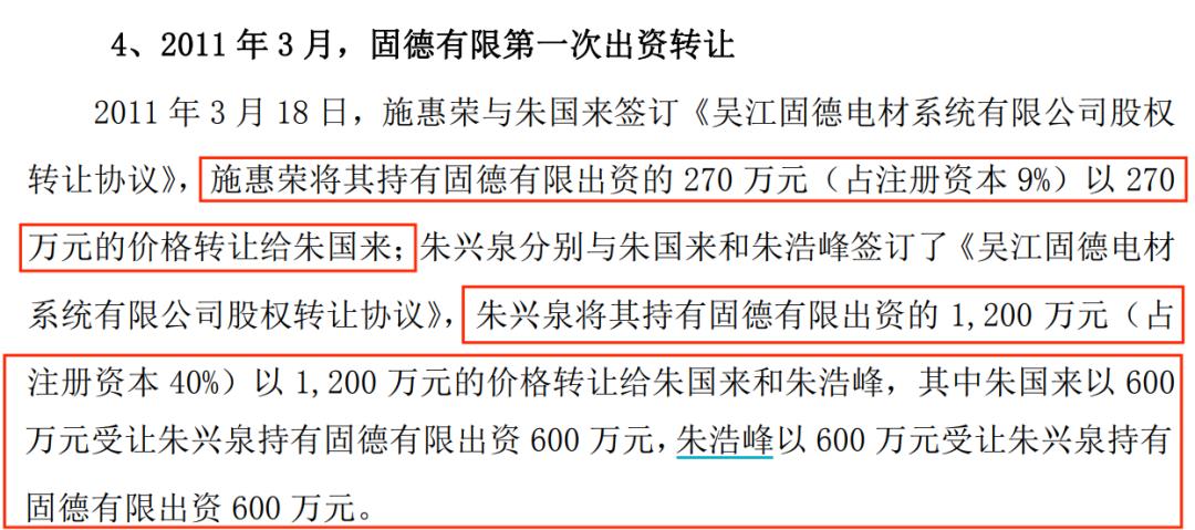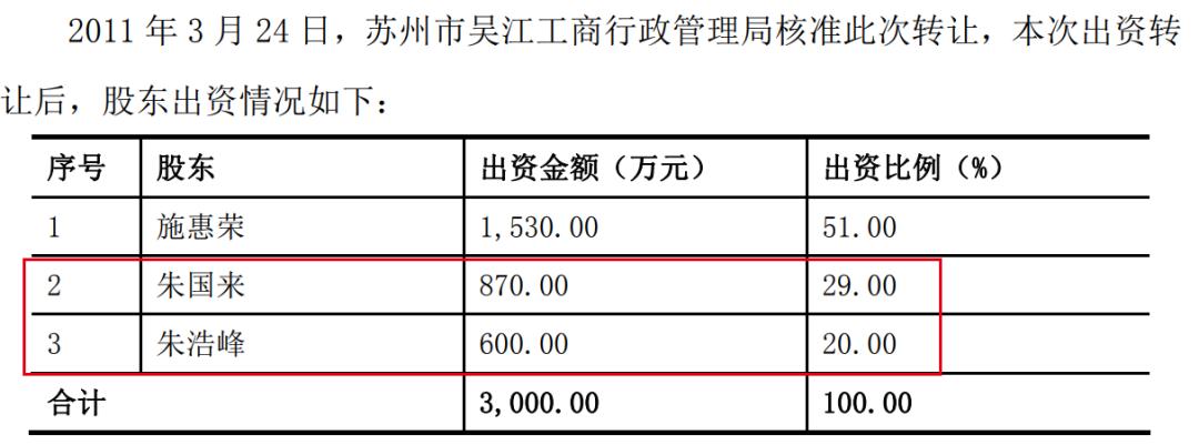 2011年3月,施惠荣向朱国来转让当时9%注册资本,代价270万元。同时,朱兴泉分别向朱国来、朱浩峰各自转让了当时20%注册资本,总价格为1200万元。据悉,朱国来、朱浩峰曾是同事。