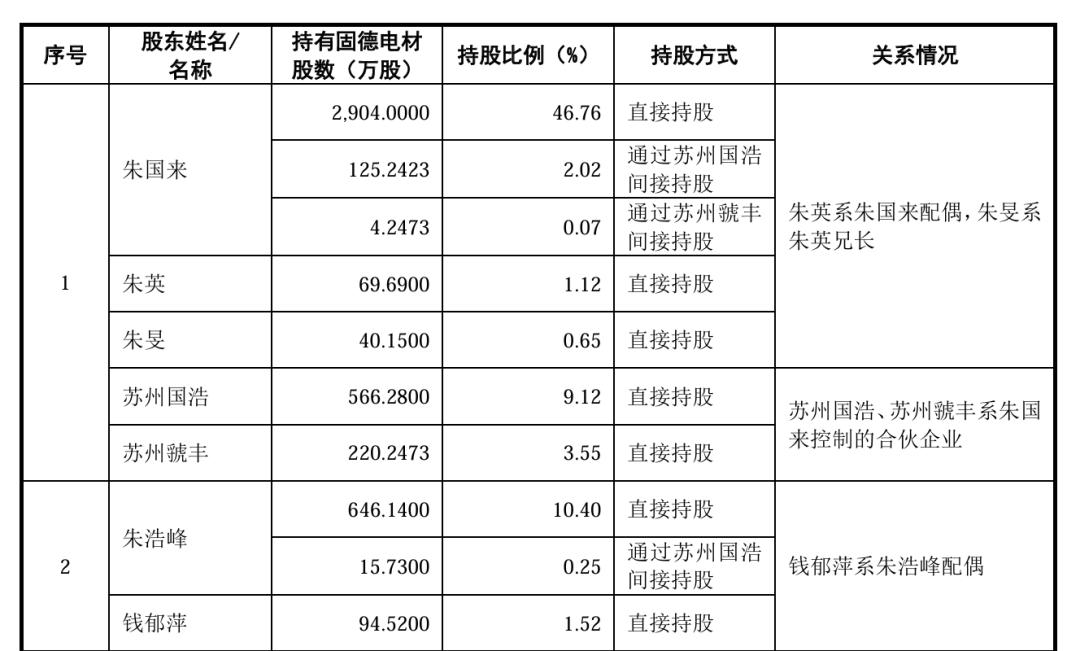 IPO前,固德电材实控人朱国来的妻子、大舅子、前同事等亲朋好友都已经进入股东行列。倘若固德电材顺利上市,朱国来的亲朋好友将共享这场“资本盛宴”。