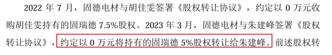 此外,2023年3月,固德电材曾将子公司固瑞德5%股权转让给朱建峰,代价为0。固瑞德成立于2022年6月,主营业务为铜铝复合材料,是固德电材拓展新材料领域的平台,2023年产线逐步建成并投产。据悉,因是同乡,朱建峰与朱国来结识。