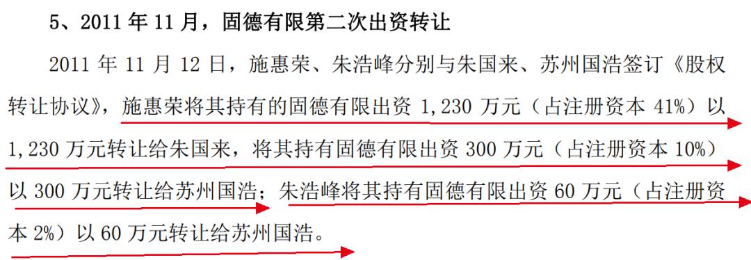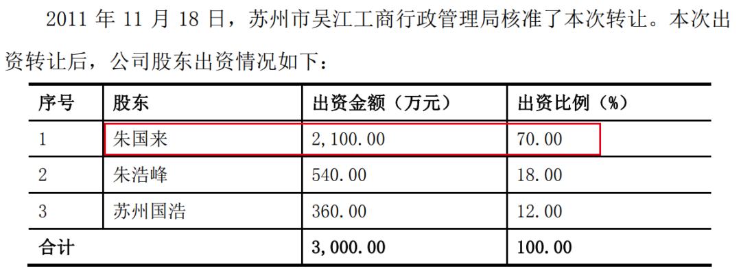 同年11月,施惠荣分别向朱国来、苏州国浩转让了当时41%、10%注册资本,退出股东行列。其中,苏州国浩是朱国来持股的企业。