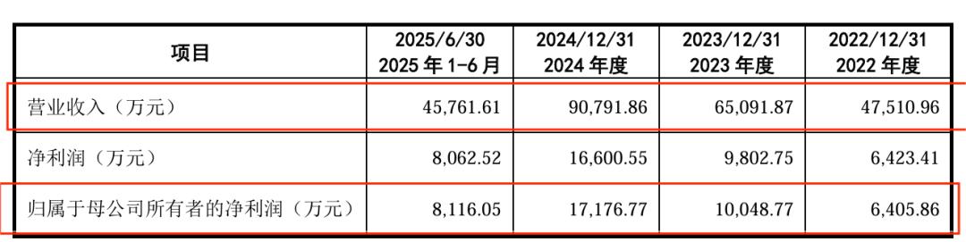 2022年至2025年上半年,公司实现营收4.75亿元、6.51亿元、9.08亿元、4.58亿元;归母净利润6405.86万元、1.00亿元、1.72亿元、8116.05万元,营收、利润双增长。