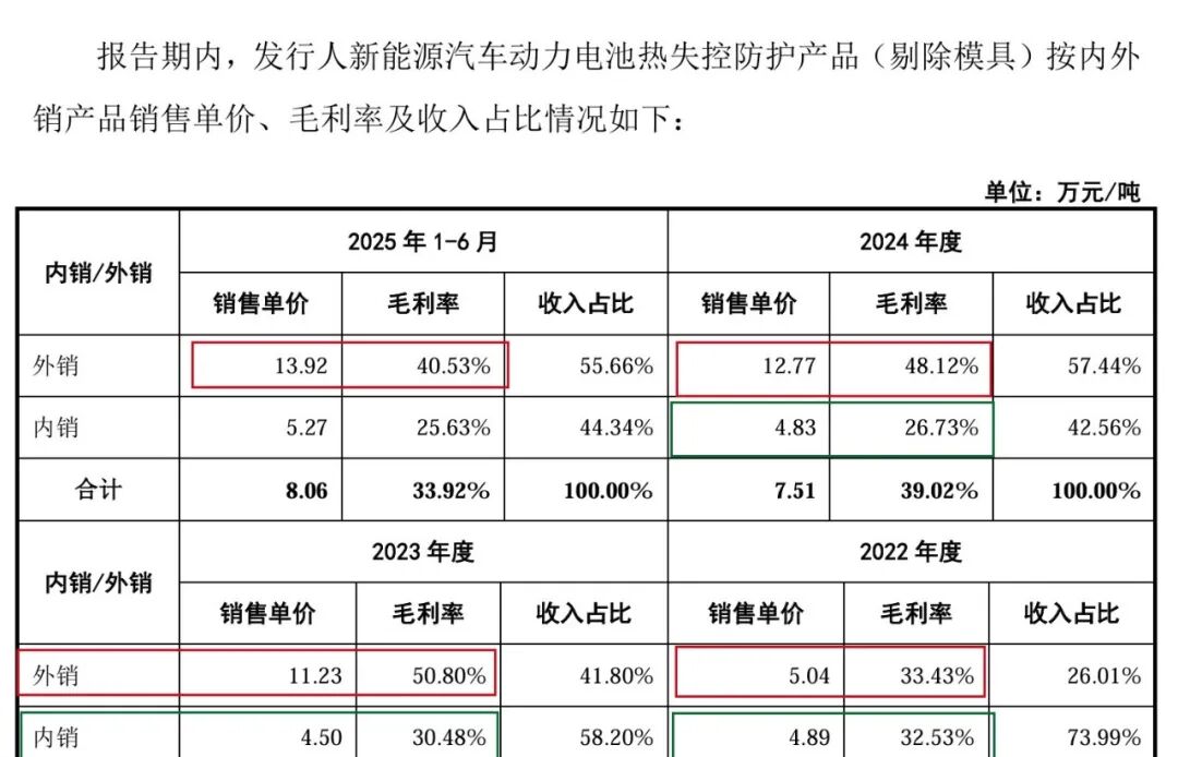 2022年至2025年上半年,固德电材动力电池零部件(剔除模具)的外销价格从5.04万元/吨,上涨至13.92万元/吨,毛利率从33.43%升至40.53%。同期,内销价格始终保持在5万元/吨左右,毛利率则从32.53%下滑至25.63%。