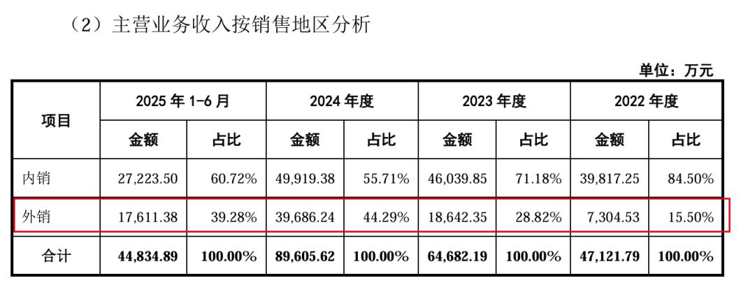 2022年至2024年,公司的外销金额分别为7304.53万元、1.86亿元、3.97亿元,占当期主营业务收入的比例分别为15.50%、28.82%、44.29%,一路走高。