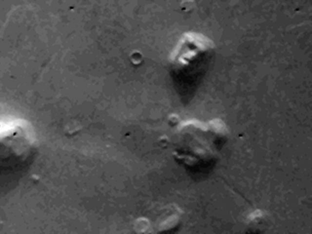 上个世纪70年代,NASA发射的海盗1号太空探测器曾在火星北半球上对塞东尼亚地区进行拍摄,意外发现了一张非常有趣的照片。照片中的山丘不仅有两个像眼睛一样对称的洞,还有鼻子和嘴巴状的凸起和凹陷,活像一张人脸。火星上发现类似人脸的消息引起了相信外星生命存在的团体的关注,认为这张“脸”是火星已消失生命曾经存在的证据。而根据NASA火星探测器发回的最新高清照片,那其实是位于火星沙漠中央地带的一座布满岩石的高山而已。