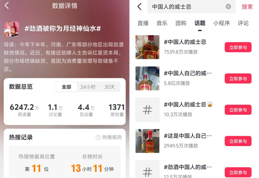社交媒体上,当网友自发创造“劲酒+红牛”、“劲酒+冰红茶”等混搭喝法时,品牌顺势在抖音打造“中国人的威士忌”话题,相关视频2025年上半年播放量突破5亿次。