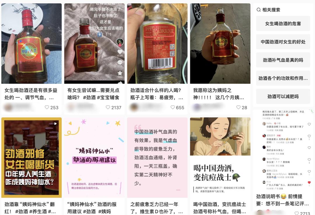 相关话题微博阅读量超过6000万,小红书上“劲酒治痛经”“大女人的酒”等话题催生400多万篇笔记。