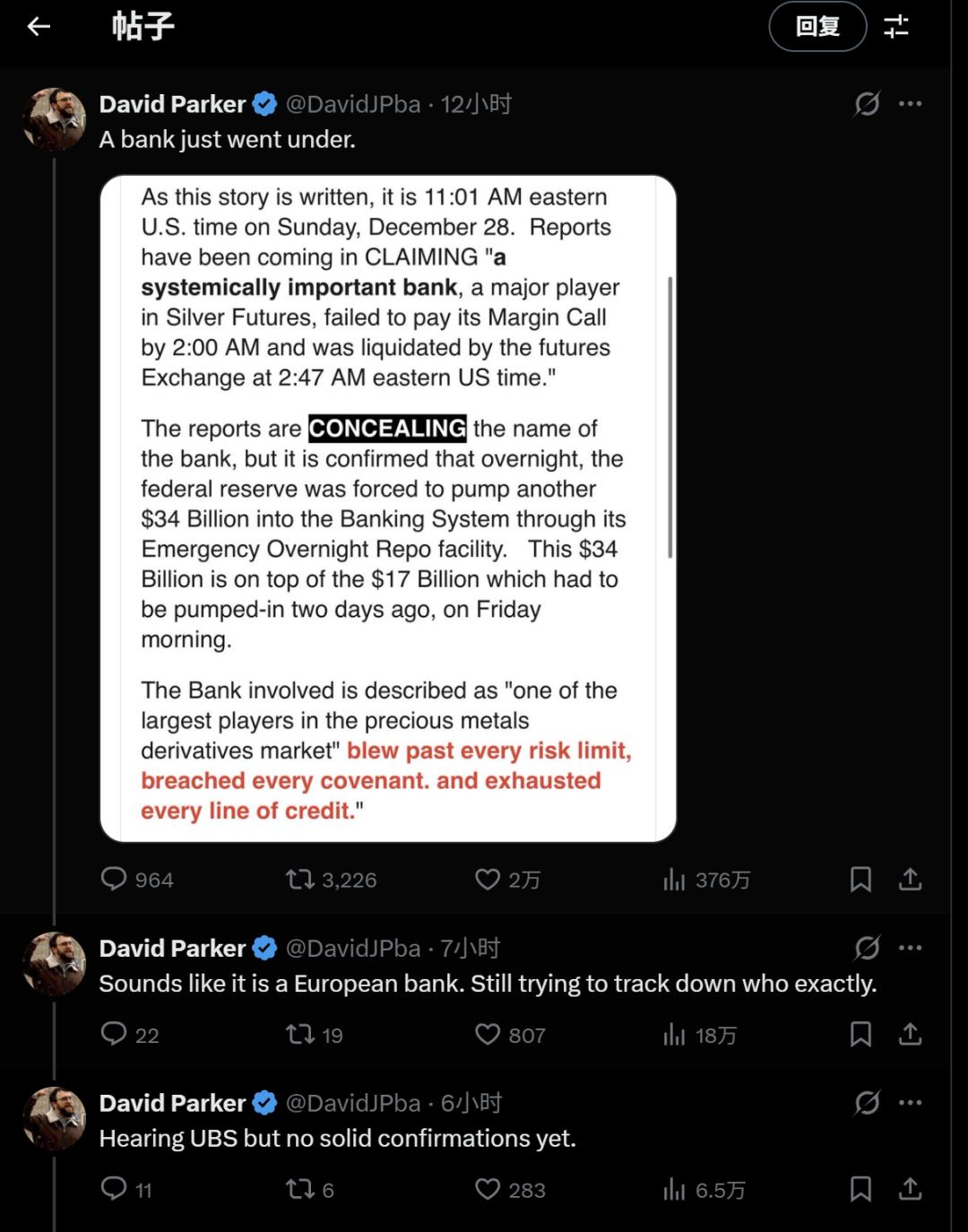 现货白银经历过山车行情之际,社交平台X上的一则传闻引爆了舆论。有用户转发某博客文章称,一家在白银期货市场持有大量空头头寸的“系统重要性银行”,因未能支付追加保证金,已于美国东部时间周日凌晨被强制平仓和接管。