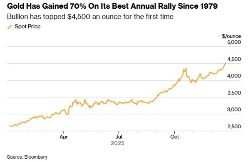 2025年12月24日,平安夜,伦敦黄金现货悄然突破每盎司4500美元。