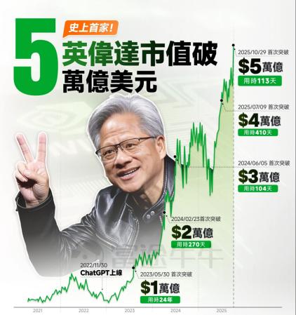 2023年5月,英伟达市值首次破1万亿;2024年2月破2万亿;2024年6月破3万亿;2025年7月破4万亿;2025年10月29日破5万亿。从4万亿到5万亿,只用了113天。