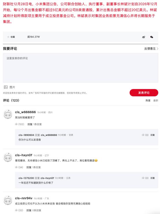 市场关注度和情绪剧烈波动,不难理解。如果说此前的财务投资人离场是“落袋为安”,那作为二号人物的林斌套现离场,就很容易在社媒评论区里看到类似直白的潜台词:“宁愿成立投资公司去外面看机会,也不想再赌小米的未来。”