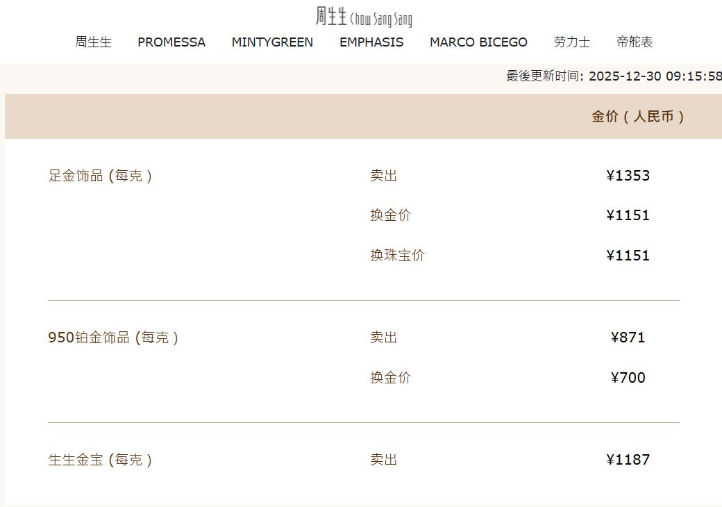 受此影响,部分国内品牌金饰价格也出现大幅下跌。30日,中新经纬查询发现,周生生金饰报1353元/克,单日下跌53元/克;老庙黄金报1359元/克,单日下跌44元/克;老凤祥报1363元/克,单日下跌45元/克。