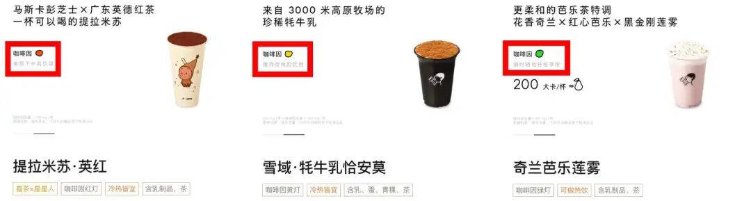 有的茶饮品牌也毫不避讳地谈论自家产品里的咖啡因,虽然不像霸王茶姬一样标注出具体数值,但会根据咖啡因含量的多少来进行分级。
