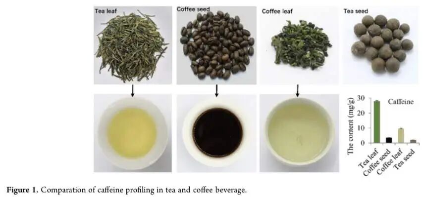 一项发表于Journal of Agricultural and Food Chemistry的研究,通过对比茶叶与咖啡植物的咖啡因代谢物发现,茶叶中的咖啡因含量显著高于咖啡相关原料。研究人员进一步对茶和咖啡类原料的咖啡因含量进行测定,得出其含量从高到低排序为:茶叶>咖啡叶>咖啡豆>茶籽。