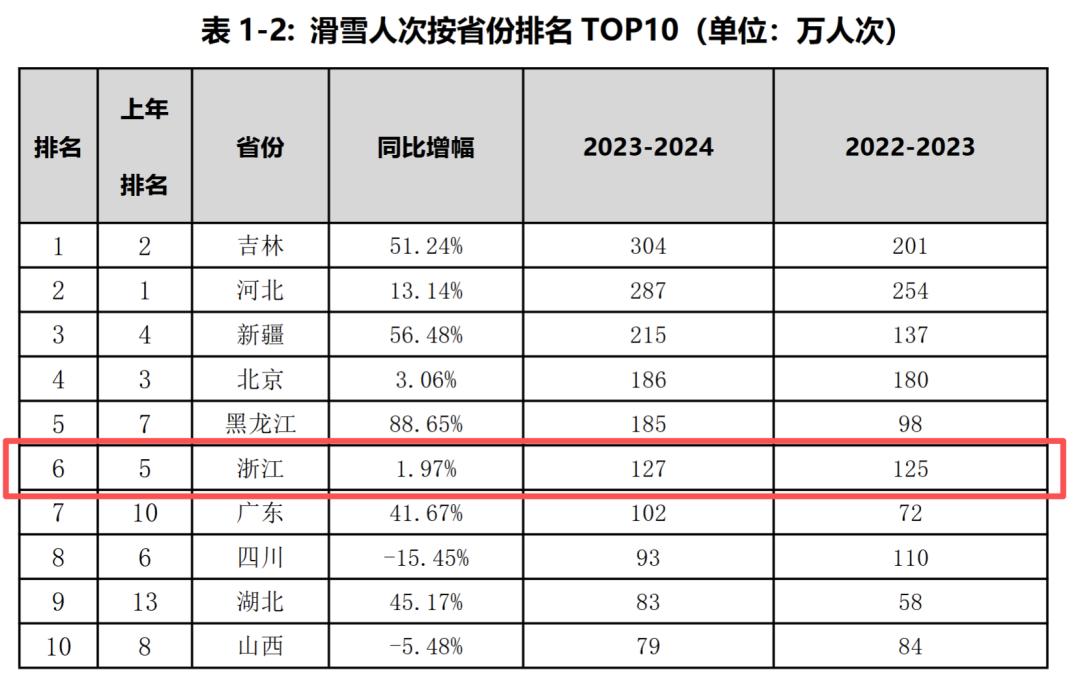 浙江滑雪人次在全国省份排名第六。(图/《2023—2024中国滑雪产业白皮书》截图)