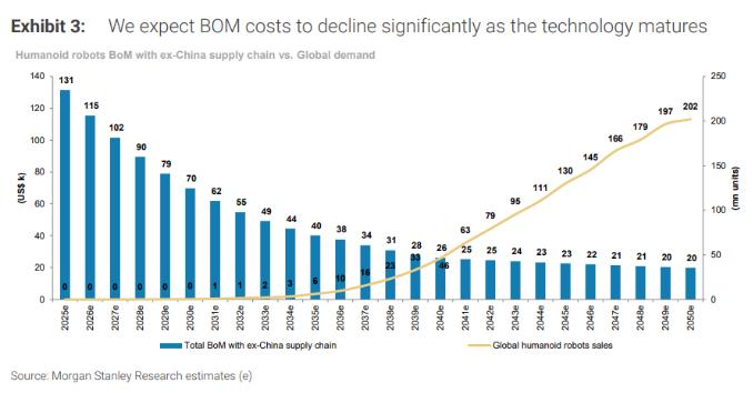 根据摩根士丹利2025年10月发布的专题报告《全球人形机器人供应链成本分析》测算,目前采用中国供应链的人形机器人BOM成本约为4.6万美元,而采用非中国供应链的成本高达13.1万美元,差距接近3倍。