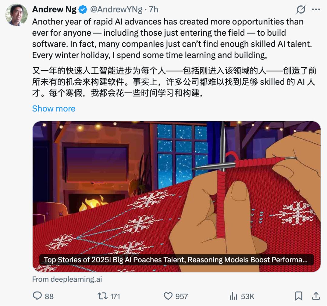 又一年,AI 以惊人的速度向前推进,为所有人 —— 包括刚进入这个领域的新手 —— 创造了前所未有的软件开发机会。事实上,许多公司现在最大的困扰之一,就是找不到足够多真正懂 AI 的工程师。