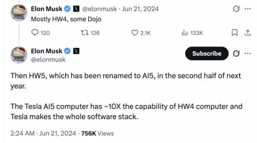 不仅如此,到 2025 年,特斯拉在 FSD V13 的基础上,又推出了参数量高达 10 倍的 FSD V14,模型参数量的倍数级放大,意味着车辆能够理解更复杂的环境信息。而同时,马斯克还多次在社交媒体上透露,特斯拉自研的下一代 AI5 算力平台,算力将会是 HW4(后来被命名为 AI4)的 10 倍。