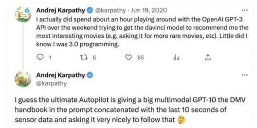 2020 年 6 月,硅谷知名 AI 大神、时任特斯拉 AI 负责人 Andrej Karpathy(业内简称为 AK)在社交媒体上发表了自己对于自动驾驶未来发展的思考,他的原话是:
