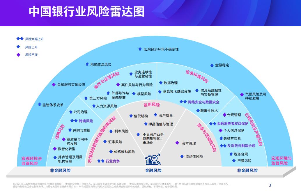 根据毕马威给出的2026年中国银行业风险雷达图,一个不得不面对的事实,是几乎所有风险都在(大幅)上升,只有极少数风险保持不变。