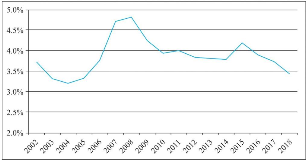 经济学家刘俏在其著作《我们热爱的金融:重塑我们这个时代的中国金融》中,通过用金融业增加值除以年末社融总量,大致得到了2002-2018年的中国金融平均中介成本: