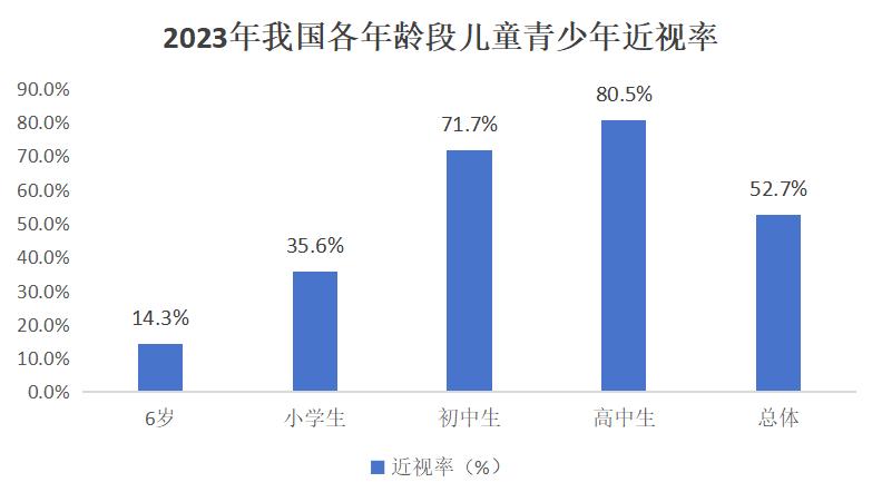 2023年国家卫健委数据显示,我国儿童青少年总体近视率为52.7%,其中6岁儿童14.3%,小学生近视率35.6%,初中生近视率71.7%,高中生近视率80.5%。