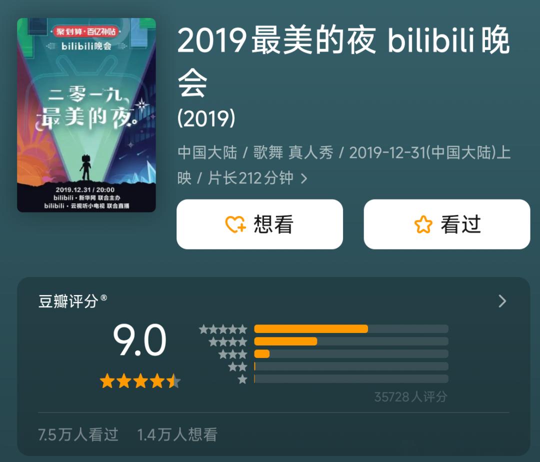 雷同的线上拼盘演唱会陷入疲劳期时,更年轻形态的跨年晚会开始崛起。2019年,B站举办了站内第一届跨年晚会“最美的夜”,同时在线人数超过8000万,晚会贴近平台原生的内容生态,突出情怀、复古、玩梗等元素,豆瓣评分高达9.0分,被媒体评价为“最懂年轻人的晚会”。